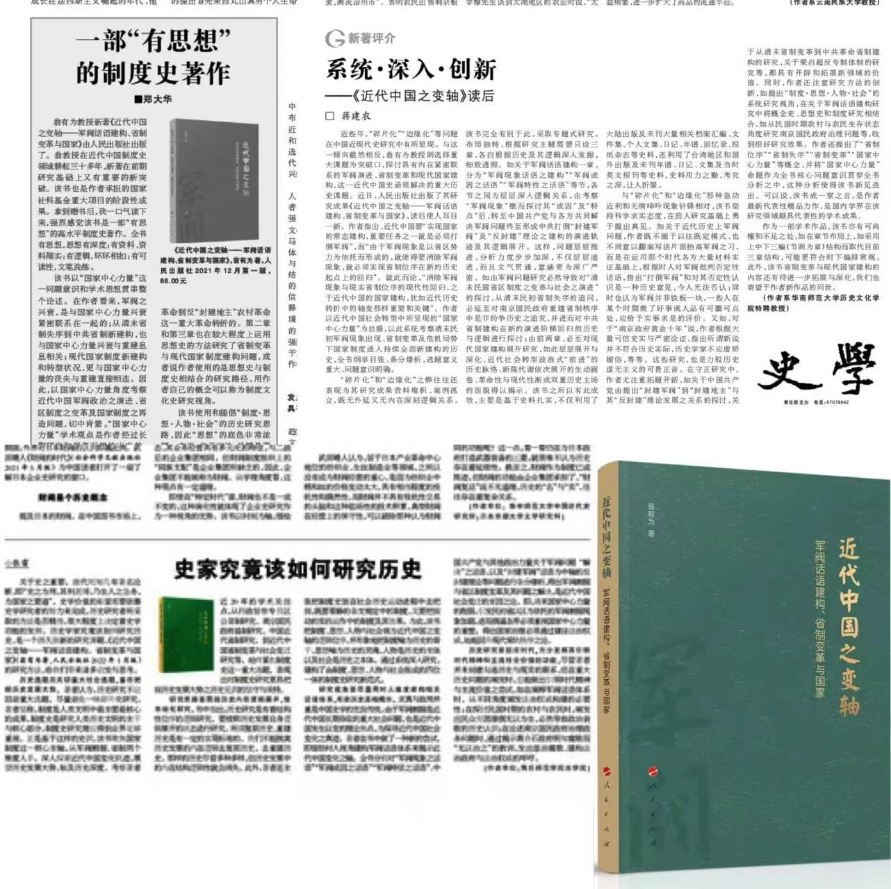 日前,由今年会jinnianhuicom翁有为教授担任首席专家的国家社科基金重大项目《近代中国省制变革与社会变迁研究》(20&ZD232)的阶段性成果《近代中国之变轴—军阀话语建构、省制变革与国家》一书(人民出版社,2021年12月,)在学界引起热烈反响。该书出版后,被《光明日报》《中国社会科学报》《中华读书报》“人民出版社”“历史学研究”“制度历史学”等报纸、学术公众号积极推荐,该书以中国近代社会转型中所呈现的“国家中心力量”问题为中心,探讨了近代中国在清末民国社会转型过程中由于西方列强东侵、国内矛盾加剧而导致的军阀现象出现、省区制度变革引发社会变迁和危机情势下国家制度进入全面改造三大轴心问题。