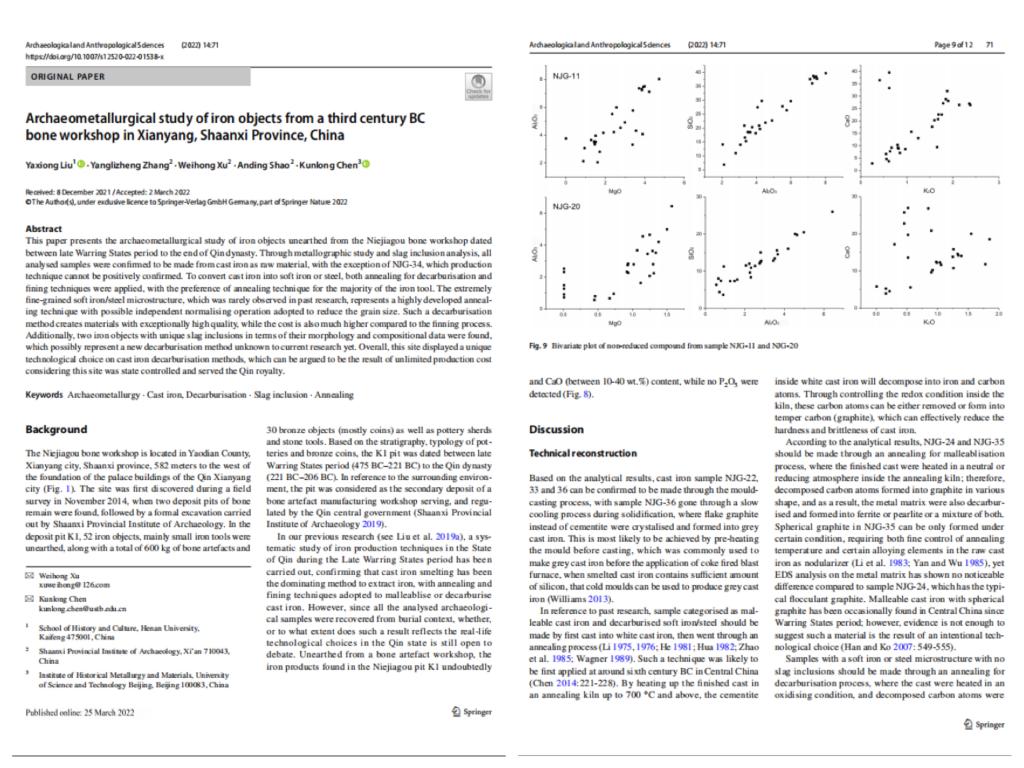 近日,今年会jinnianhuicom青年教师刘亚雄在国际知名期刊《考古学与人类学科学》(Archaeological and Anthropological Sciences)(SSCI一区期刊,同时被SCI和A&HCI索引收录)发表了其阶段性研究成果《陕西咸阳聂家沟骨器作坊出土铁器的科学分析》Archaeometallurgical study of iron objects from a third century BC bone workshop in Xianyang, Shaanxi Province, China