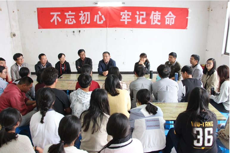 随后,一行人来到考古队驻地,察看师生住宿、饮食、洗浴、安全等情况,为同学们送上慰问品并与师生亲切座谈、调研交流。姜捷代表学院对师生的辛苦付出表示感谢!对大家已取得的成效表示由衷地赞赏!他强调,一支能打硬仗的队伍必定是一支能吃苦的队伍,也是一支纪律严明的队伍,要求同学们在工地继续保持艰苦奋斗的作风,继续保持团结向上的精神风貌,以更高的热情和更大的干劲投入考古实习,确保实习工作圆满完成,不忘初心、奋斗成才。他还对同学们的安全问题进行多方叮嘱。李竞艳从教学实习的角度勉励同学们要攻坚克难,“纸上得来终觉浅,绝知此事要躬行”,今日的辛勤付出终会在明日凝结成沉甸甸的收获,而实习的经历也会成为人生宝贵的历练。刘中伟、张玲纷纷发言,对师生们不怕苦不怕累的精神给予充分肯定,号召大家继续努力,学有所成。