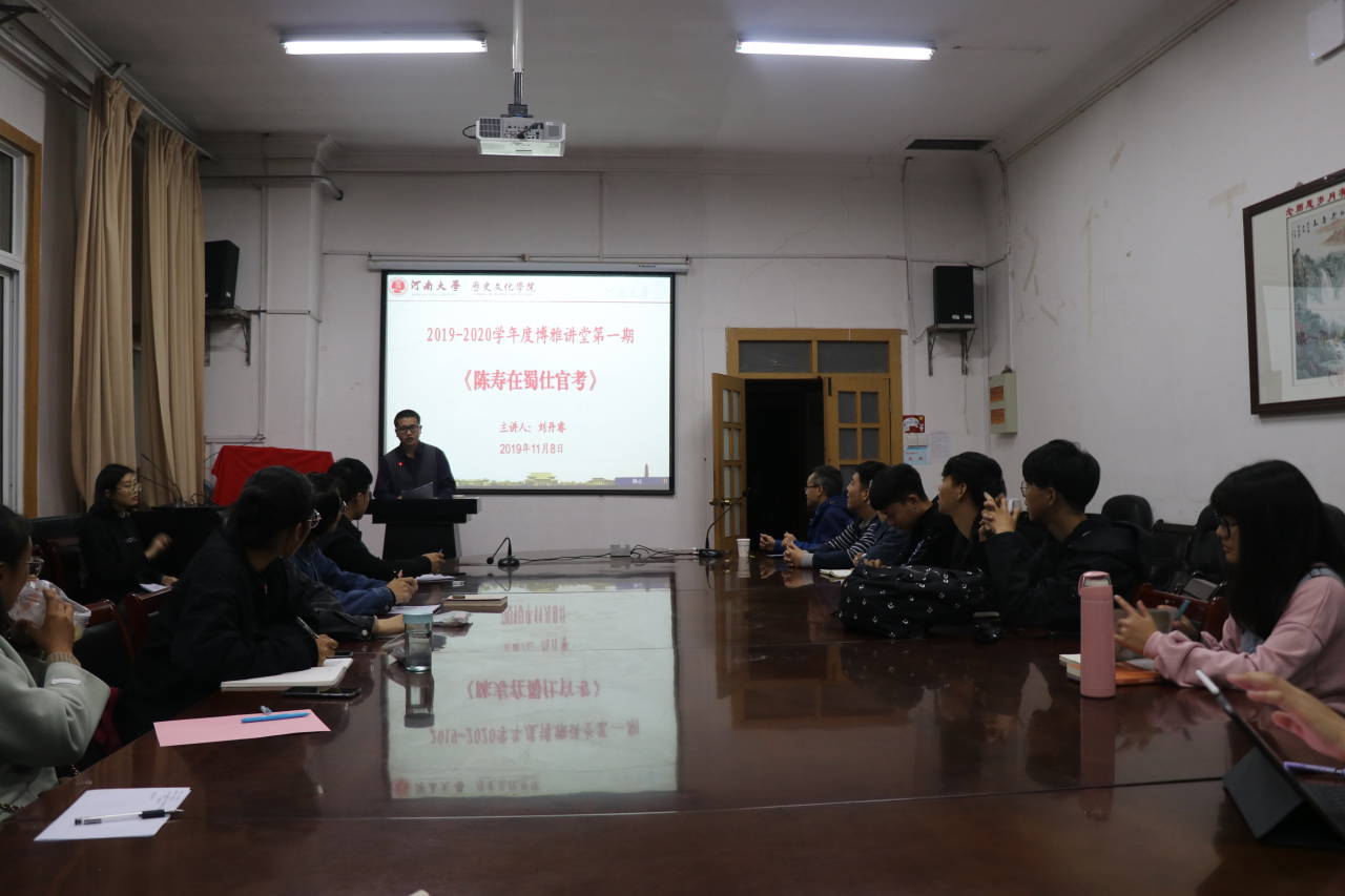 11月8日下午,由今年会jinnianhuicom团委学生会主办的博雅讲堂活动第一期在今年会jinnianhuicom三楼会议室顺利举行。本期博雅讲堂邀请到了中国史专业本科二年级的刘丹睿同学,为大家带来题为《陈寿在蜀仕官考》的报告。