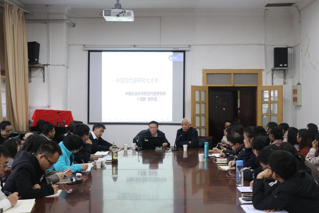 在本次讲座中,卜先生以中华人民共和国成立70周年为契机为师生梳理新中国成立以来中国古代史研究的发展历程,并总结经验和教训。卜先生将新中国成立70以来的古代史研究分为中华人民共和国成立后30年和改革开放40年两个阶段。首先,卜先生将前30年中国古代史研究分为十七年史学与文革中的史学两个阶段。从马克思主义史学主导地位的确立及其标志、“五朵金花”的讨论与评价、若干历史理论问题的辩论、学科建设成就与史学研究的收获以及“文革”中的史学五个方面讨论新中国成立后30年古代史研究的优点和不足。指出,虽然中华人民共和国成立后30年的古代史研究存在着对马克思主义教条化的理解、学术研究过度政治化的偏差,但总体上取得了很大的成绩,奠定了新中国历史学的基础。其次,卜先生从时代变迁与史学研究的新发展、研究领域的深化与学科体系构建的完善以及历史理论与史学理论的丰富发展等三个方面介绍改革开放40年的古代史研究,指出改革开放后史学研究的政治与社会环境发生了根本改变,史学研究领域扩展,学科建设得到很大发展,人才培养与组织机构建设成绩卓著。