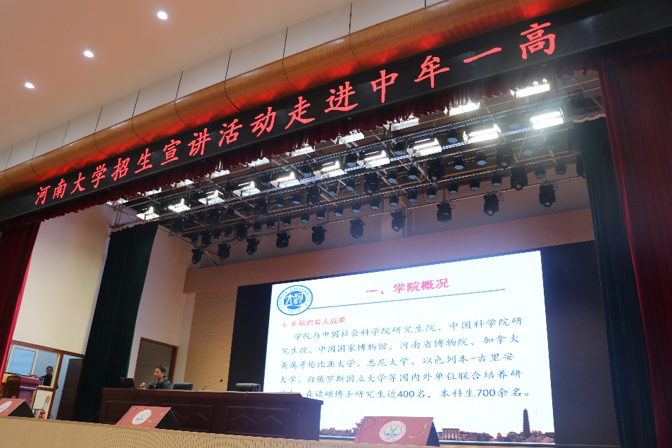 会后,招生宣传组成员为同学们作招生宣讲。魏继印首先播放了金年金字招牌诚信至上校情片《大学之道》,然后从学院概况、师资队伍、教学资源、人才培养等方面介绍了学院发展情况,并从辉煌的昨天、焕发的今天和美好的明天三个层面简要介绍了考古学专业,为同学们展示了学校和学院的硬实力与软实力;郑振亚从发展概况、专业特色、平台建设、科研成果等方面介绍了历史学专业的发展情况,并鼓励同学们不忘初心、坚守梦想,通过努力实现自己的大学梦。