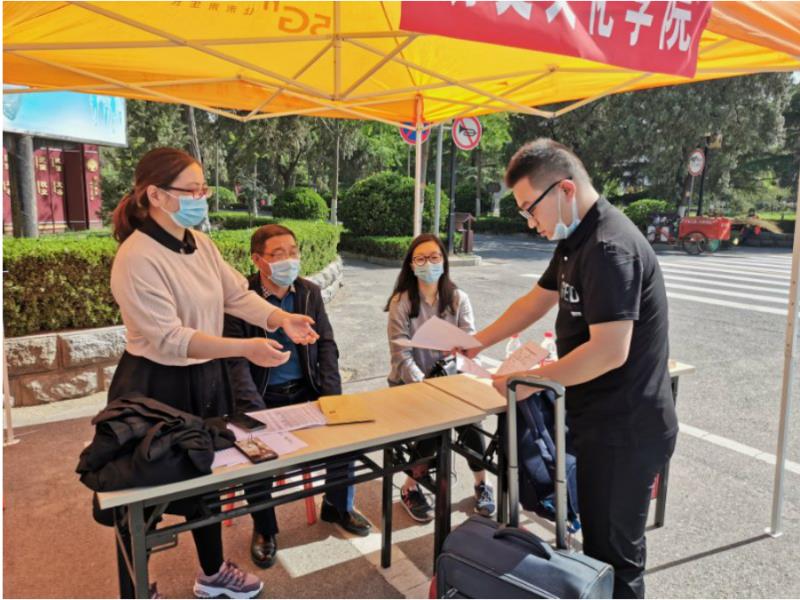 学院领导班子高度重视第二批研究生返校工作,制定了详细的返校工作方案,组建了由学院党委副书记姜捷为组长,两办主任、团委负责人、辅导员为组员的一线接待工作小组。接待成员于5月13日早上七点半按时到岗,全身心投入到接待工作,在接到返校同学时,姜捷亲切地询问了他们的返程防疫防控情况,解释返校后学校的管理方式和相关的纪律要求等,鼓励学生争做自律守纪的模范,并陪同研究生院白宪臣副院长等与最早报到的两位学生合影留念。按照学校相关规定和要求,工作人员现场认真查验返校学生提交的报到材料。其间,研究生辅导员肖莹还为没有吃饭的学生提前准备了早餐。
