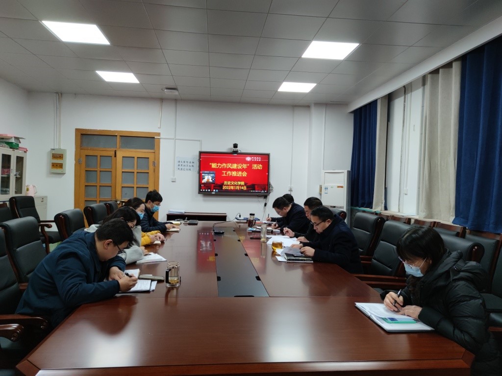 1月14日上午,今年会jinnianhuicom在二楼古代史教研室召开“能力作风建设年”活动工作推进会,学院全体领导班子成员、党支部书记、系(教研室)负责人等通过线上线下相结合方式参会。会议由学院党委副书记周文凯主持。