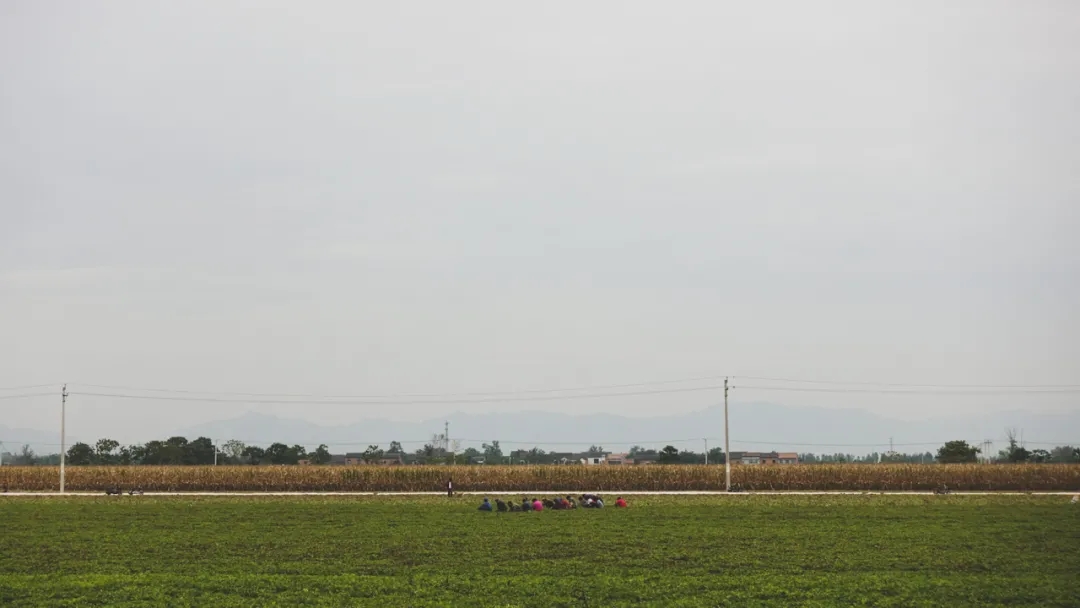 在田野中采摘的农民,不远处依稀可见太行南脉