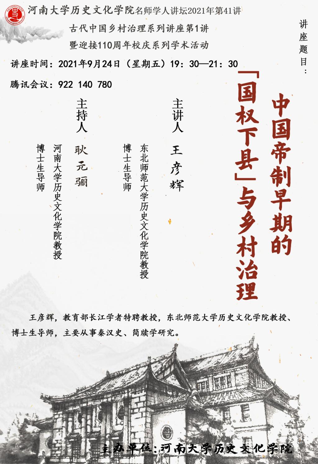 【讲座通知】王彦辉:中国帝制早期的「国权下县」与乡村治理