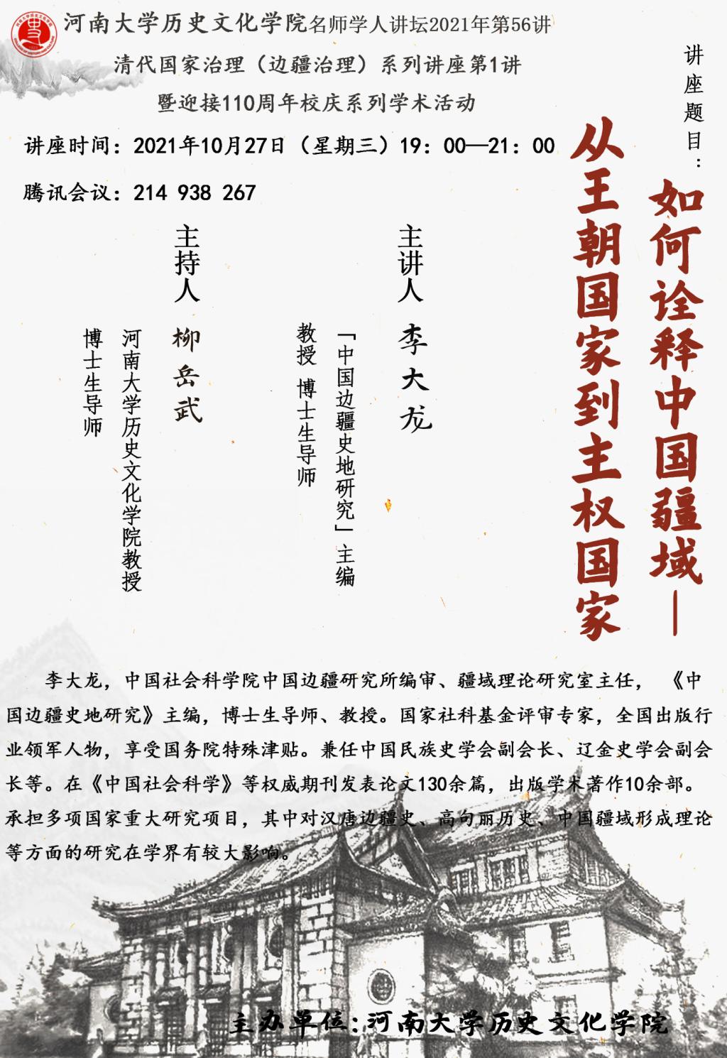 【讲座通知】李大龙:如何诠释中国疆域——从王朝国家到主权国家
