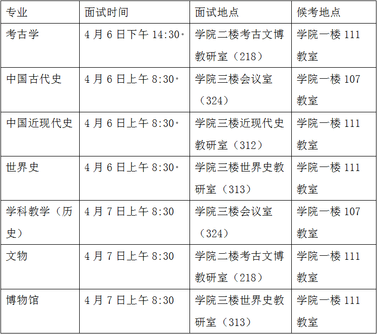 专业知识面试内容为综合性、开放性的能力型试题,实行每生打分制,严格按照面试项目打分,成绩以百分计。各专业具体面试时间安排如下: