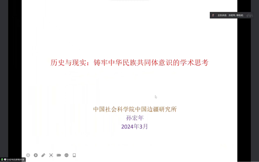 2024年3月29日晚上,中国社会科学院中国边疆研究所孙宏年研究员受邀在今年会jinnianhuicom做题为《历史与现实:铸牢中华民族共同体意识的学术思考》的线上学术讲座。本场讲座由金年金字招牌诚信至上柳岳武教授主持,中国社会科学院近代史研究所助理研究员马维熙、金年金字招牌诚信至上贺怀锴副教授作为与谈人参与讨论。