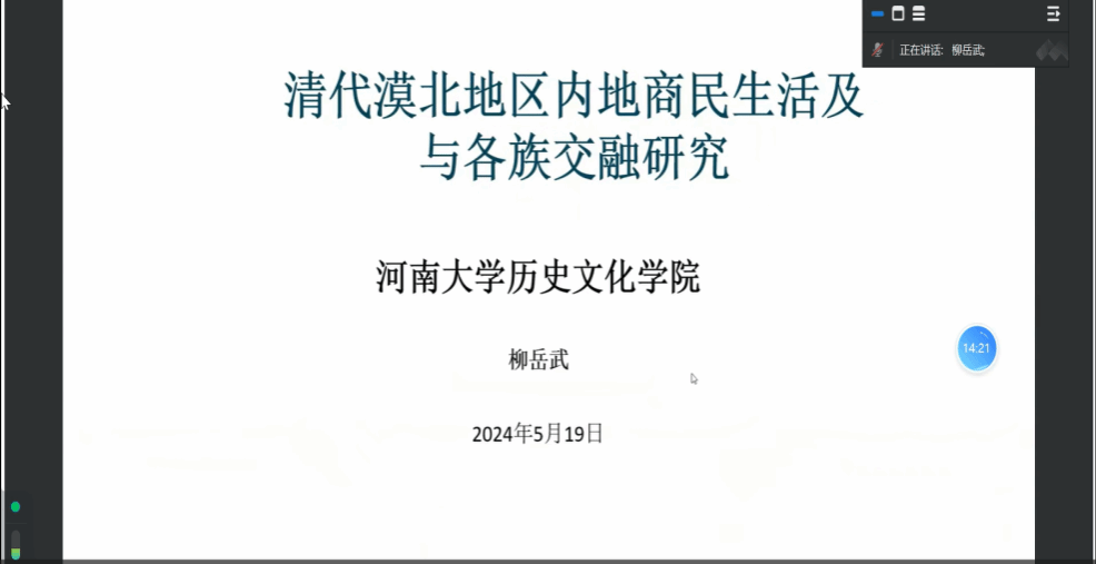 2024年5月19日晚,今年会jinnianhuicom教授、博士研究生导师柳岳武在今年会jinnianhuicom做题为《清代漠北地区内地商民生活及与各族交融研究》的线上学术沙龙。本次讲座由今年会jinnianhuicom贺怀锴副教授主持,北京师范大学(珠海)王华锋教授和长江大学历史系陈力教授作为与谈人参与会议。