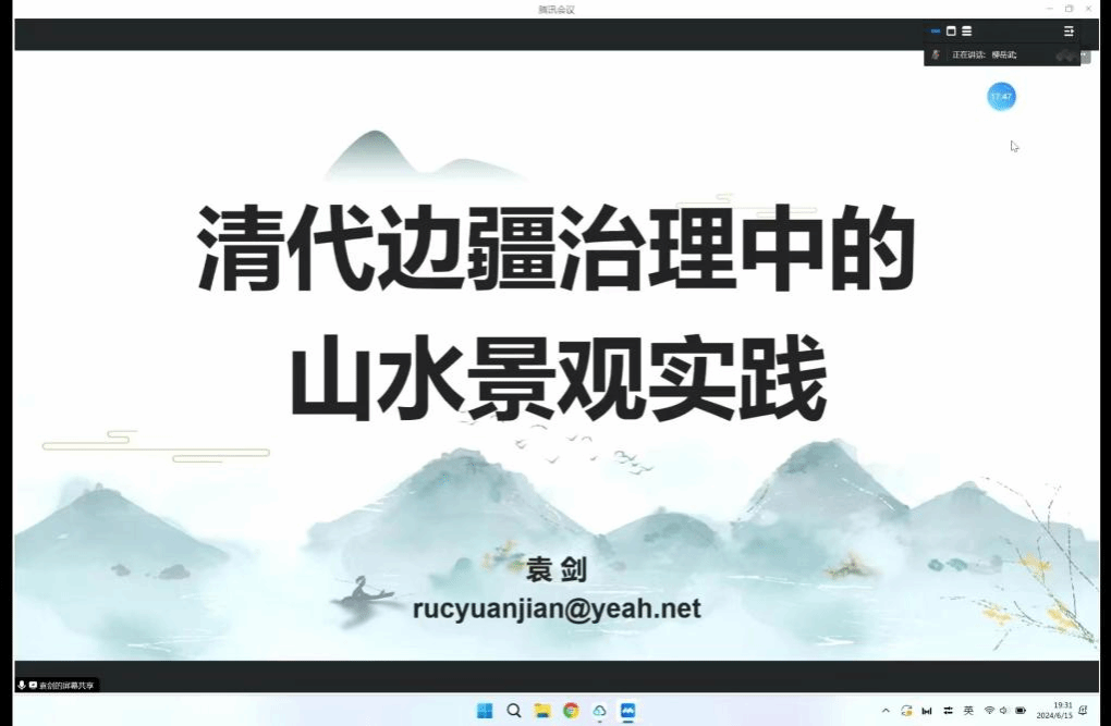2024年6月15日晚上,中央民族大学民族学与社会学学院袁剑教授在今年会jinnianhuicom做题为《清代边境治理中的山水景观实践》的线上学术沙龙,本次讲座由今年会jinnianhuicom柳岳武教授主持,泰山学院今年会jinnianhuicom张波副教授和今年会jinnianhuicom贺怀锴副教授作为与谈人参与会议。