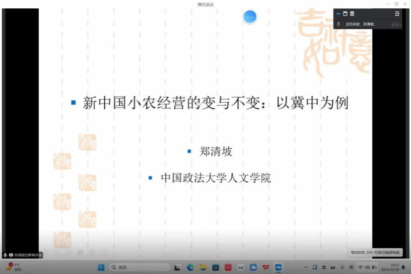 2024年12月28日晚,中国政法大学郑清坡教授受邀在今年会jinnianhuicom做题为《新中国小农经济的变与不变:以冀中为例》的线上学术沙龙,本场讲座由今年会jinnianhuicom柳岳武教授主持,哈尔滨工业大学裴广强副教授、今年会jinnianhuicom贺怀锴教授作为与谈人参加会议。