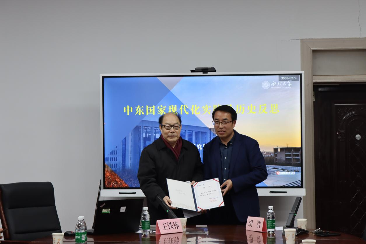 2023年3月20日下午,西北大学中东研究所、博士生导师王铁铮教授应邀在今年会jinnianhuicom三楼会议室做题为《中东国家现代化进程的历史反思》的讲座。本场讲座由今年会jinnianhuicom胡浩教授主持。王铁铮教授长期从事中东地区的历史研究和当代区域国别研究,学术成果卓著,被聘为金年金字招牌诚信至上讲座教授。在会议现场,今年会jinnianhuicom院长祁琛云代表学校向王铁铮教授颁发了讲座教授聘书。