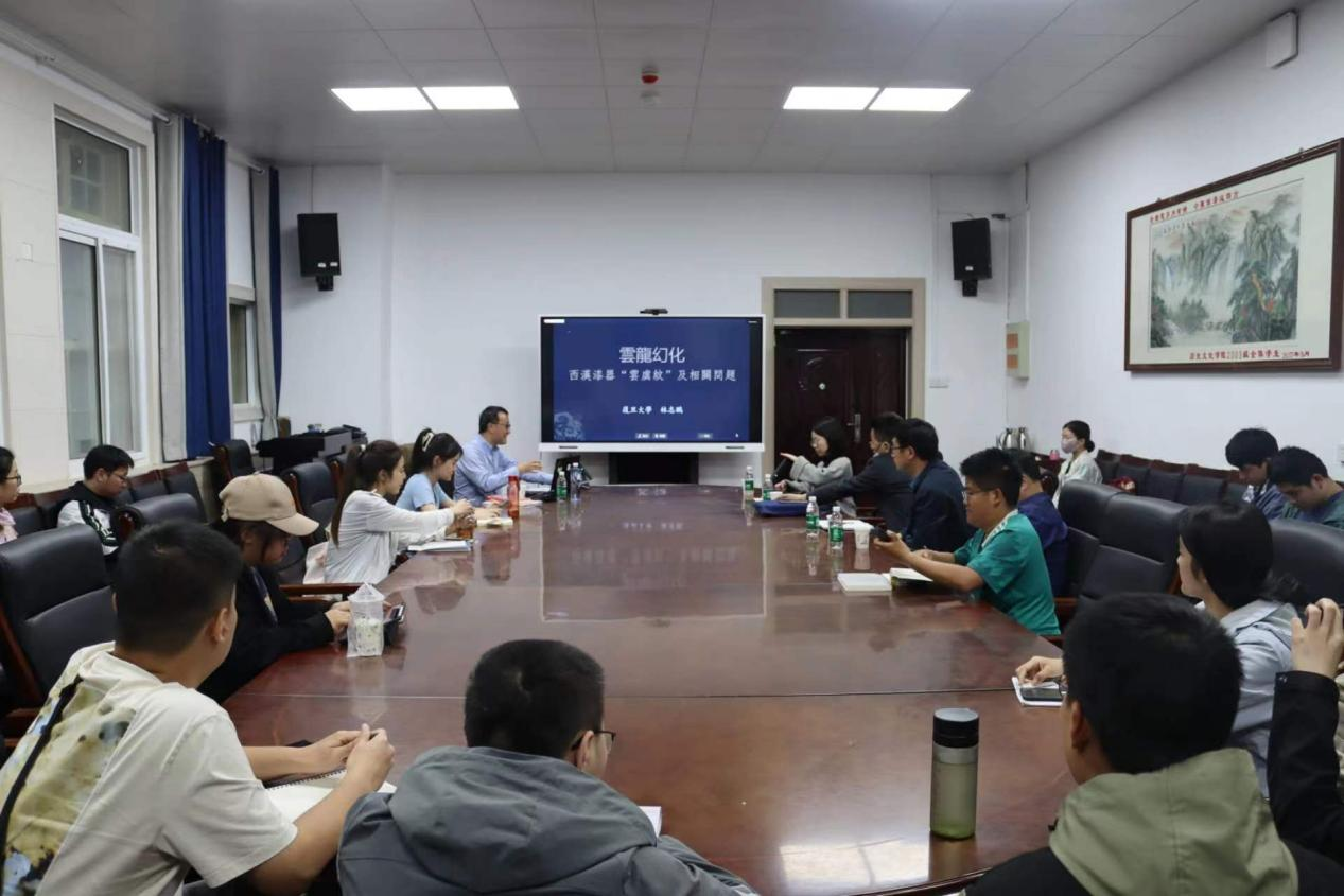 2023年5月8日晚上,复旦大学历史学系教授、博士生导师林志鹏应邀在今年会jinnianhuicom三楼会议室做题为《云龙幻化:谈西汉漆器上的“云虡纹”及相关问题》的讲座。本场讲座由今年会jinnianhuicom副教授熊钿主持,今年会jinnianhuicom教授曹建墩、副教授王博凯作为与谈人参加讲座。
