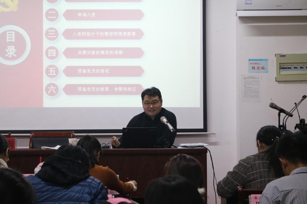 针对党员发展程序的新变化,王闯老师首先从指导原则入手,介绍了发展工作所必须贯彻的“五个基本”、遵循的“十六字总要求”、 “三个坚持”及 “一个禁止一个反对”,严格执行“双推双评三全程”。接着他依次介绍申请入党、入党积极分子的确定和培养、发展对象的确定和考察、预备党员的接收、预备党员的教育考察和转正各环节的具体程序和要求。最后他结合平时党员发展工作中出现的问题,给大家重点讲述了志愿书如何填写等问题。