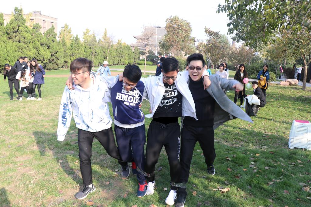 活动在轻松愉悦的氛围中有条不紊地展开。首先是“趣味钻呼啦圈”,活动考验同学们配合默契度,每组成员都手拉手围成一个圈,在两个同学的手之间套上呼啦圈,一位同学迅速钻过呼啦圈并传递给下一位同学。同学们各自发挥优势,身手矫健,稳稳地将呼啦圈传给队友,展现出良好的团结协作能力。接下来是妙趣横生的“智力运水工掷水杯”活动,一杯水从起点开始经由四个人小心翼翼的传递,并随着第四名队员连转十圈,以冲刺的速度到达终点,等候在终点的队员两人合作反手投掷乒乓球,环环相扣,可谓体力与智力的双重比拼,旁观的同学也为各个组捏一把汗。随后是“带球赛跑四人五足”,裁判发令哨响,同学们一边保护背后的气球一边足下生风,迅速折返跑过赛场,为四人五足争取时间。