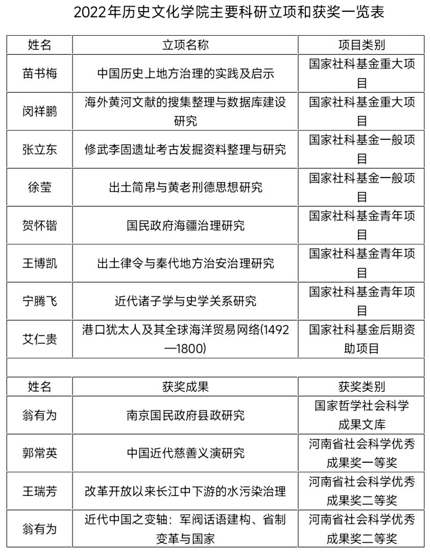 2022年今年会jinnianhuicom获各类科研奖励12项。翁有为教授的《南京国民政府县政研究》入选国家哲学社会科学成果文库。郭常英教授获河南省社会科学优秀成果奖一等奖,王瑞芳教授和翁有为教授获二等奖。