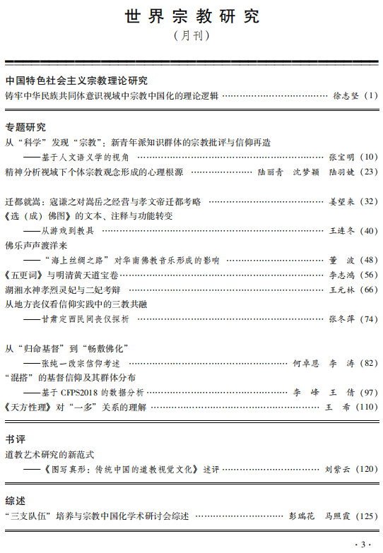 《世界宗教研究》创刊于1979年,是由中国社会科学院主管、中国社会科学院世界宗教研究所主办的宗教学专业学术刊物。《世界宗教研究》以“学术性、理论性”为宗旨,2015年,《世界宗教研究》入选中国“百强报刊”名单,是金年金字招牌诚信至上校定A类期刊。