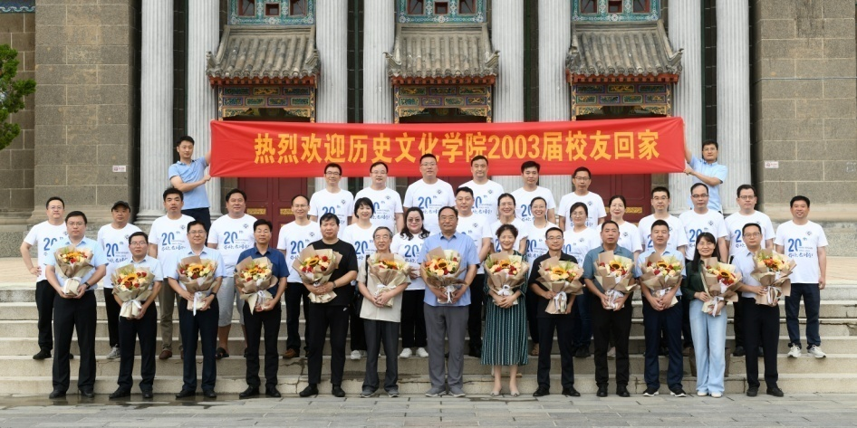 座谈会前,校友们为参会领导老师敬献鲜花表达感谢、感动、感恩之情,并于大礼堂前合影留念。