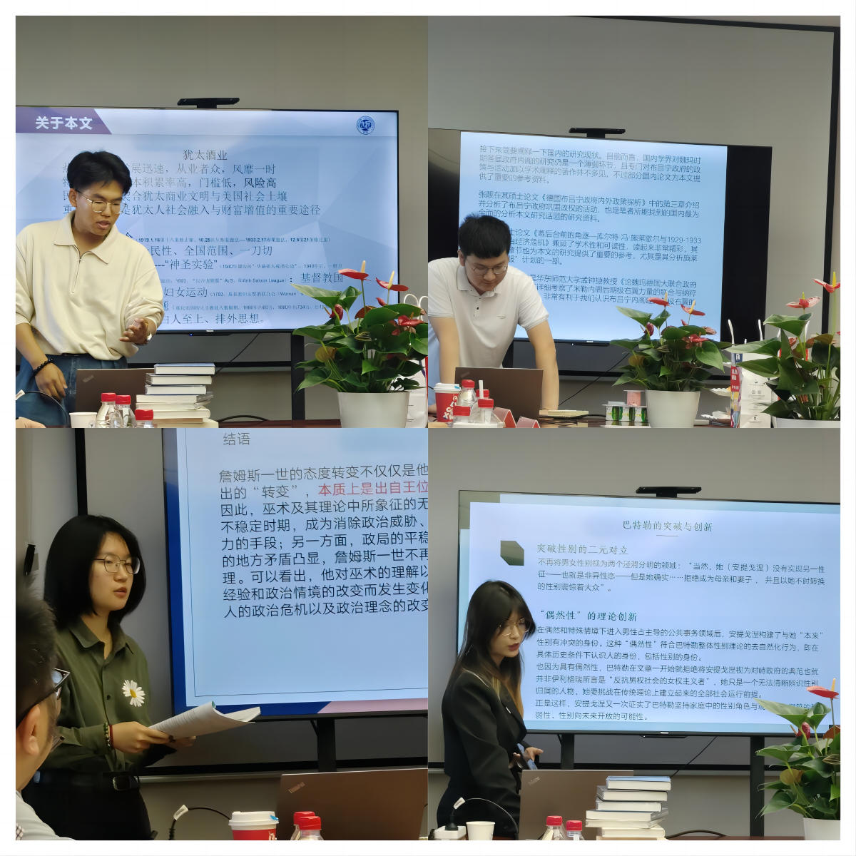 本次论坛共有双方学校的8名本科生汇报论文。唐雨瑶,马承煜,孙译林,樊宇卓等四位同学代表金年金字招牌诚信至上明德计划世界史实验班进行汇报,他们汇报的题目分别是:“从《安提戈涅的诉求:生与死之间的亲缘关系》看朱迪斯·巴特勒的学术思想”“美国禁酒令下犹太酒业的流变”“魏玛德国布吕宁政府对纳粹兴起的应对”“王权与猎巫——浅析詹姆斯一世对猎巫的态度转变”。浙江大学历史学院汇报题目分别为:“在‘加洛林里昂’反迷信:阿戈巴尔德《论冰雹与雷霆》译释”“美学中的政治共同体:席勒和《审美教育书简》”“安托万·巴纳夫的历史哲学与政治哲学—《法国革命引论》析义”“卫生、流通与秩序:路易十四治理巴黎”。在每一位同学的汇报结束后,都会由对方学院的专业教师对其论文进行认真细致地点评,指出存在的不足之处,并给出详细且具有建设性的修改建议。针对老师们的点评和指导,同学们表现出了极大的热情和求知欲,认真听取意见,及时作出回应,整理关键笔记和资料,并在茶歇时间与老师当面进行了更加深入的探讨交流。双方老师耐心修改指正,同学们认真聆听学习,现场讨论热烈,学术氛围浓厚。闭幕式上,胡浩对本次学术论坛作总结发言。他指出,交流学习是促进双方共同进步的重要渠道,并对本科生的论文选题提出了具有针对性的建议。此外,胡浩代表学院向浙江大学历史学院赠送今年会官网教师已出版的代表性著作。本次学术论坛也在双方师生的热烈掌声中正式完满落幕。