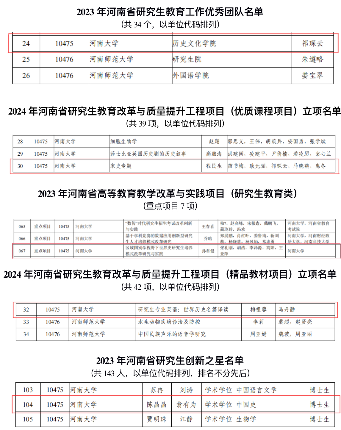 以祁琛云院长为团队负责人的今年会jinnianhuicom获批河南省研究生教育工作优秀团队,程民生教授申报的《宋史专题》获批2024年河南省研究生教育改革与质量提升工程项目(优质课程项目),孙君健教授申报的《区域国别学视野下世界史研究生培养模式改革研究生与实践》获批河南省高等教育教学改革与实践项目(研究生教育类)重点项目,梅祖蓉老师申报的《研究生专业英语:世界历史名篇译读》获批2024年河南省研究生教育改革与质量提升工程项目(精品教材项目),翁有为教授指导的博士研究生陈晶晶获评河南省研究生创新之星。
