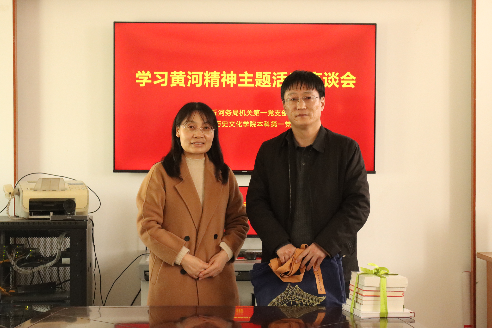 黄河涛涛涌千里,黄河精神代代传。学院师生第一站首先来到封丘黄河段曹岗险工处,与封丘黄河河务局机关第一党支部进行座谈交流。封丘黄河河务局副局长王建营介绍了封丘黄河段整体概况以及近年来该段防汛治理和生态环境保护情况,并期待与学院在探索黄河文明,弘扬黄河文化等方面加强合作。李竞艳对封丘黄河河务局的热情接待表示感谢并介绍了学院概况,她表示学院愿意发挥在中国史、文物与博物馆和考古学等方面的专业优势,为推动黄河生态保护、黄河精神传承发展提供智力支持,也希望双方能够在促进学生专业实践、社会服务和文化传承等方面加强合作,助力人才培养质量提升。