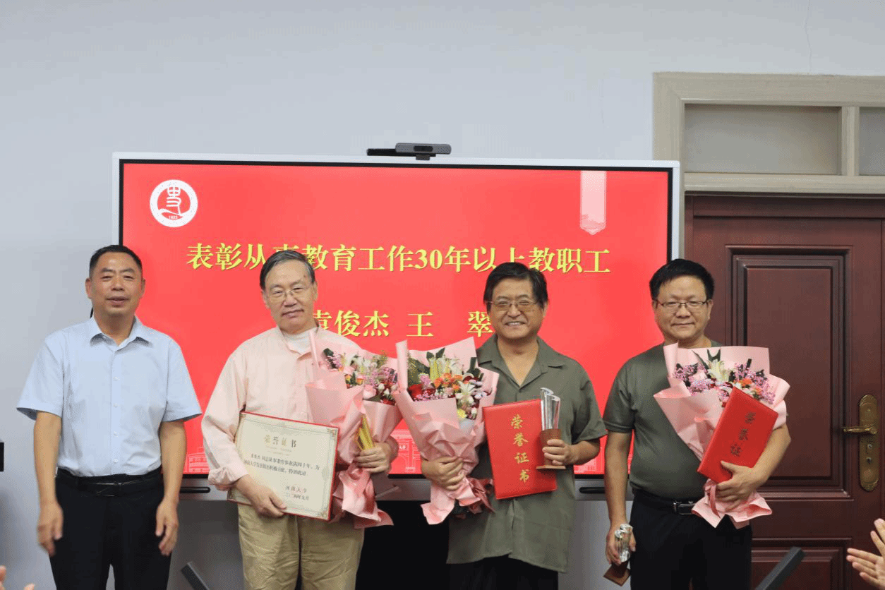 张占党宣读《金年金字招牌诚信至上关于表彰从事教育工作30年以上教职工的决定》,并为学院新增从教满40年的袁俊杰、王翠和新增从教满30年的张立东、邱胜利老师颁发证书和奖杯。