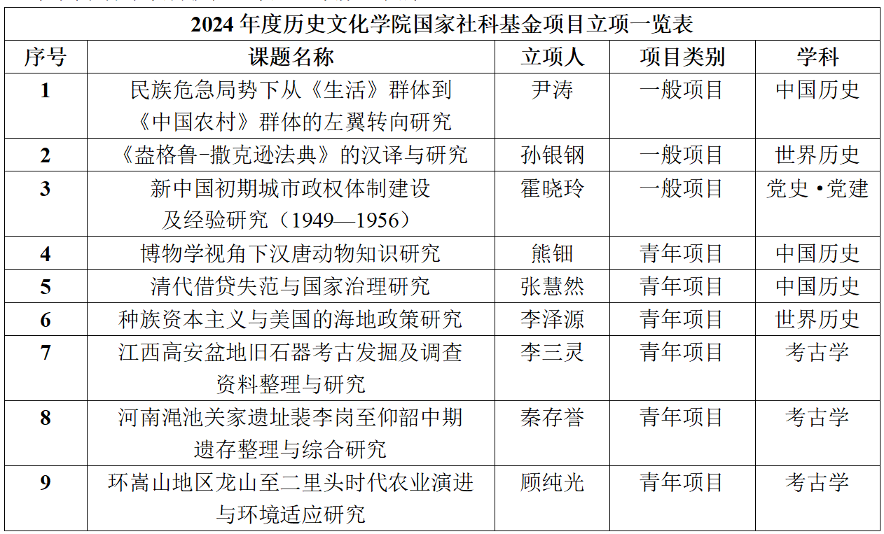 近日,2024年度国家社科基金项目立项结果发布,今年会jinnianhuicom共获批9项,包括一般项目3项,青年项目6项,涵盖中国史、世界史、考古学、党史·党建等4个学科,立项数居全校第一。另外金年金字招牌诚信至上历史学类国家社科基金项目共获批11项,立项数全国并列第一;其中青年项目获批8项,立项数全国第二。