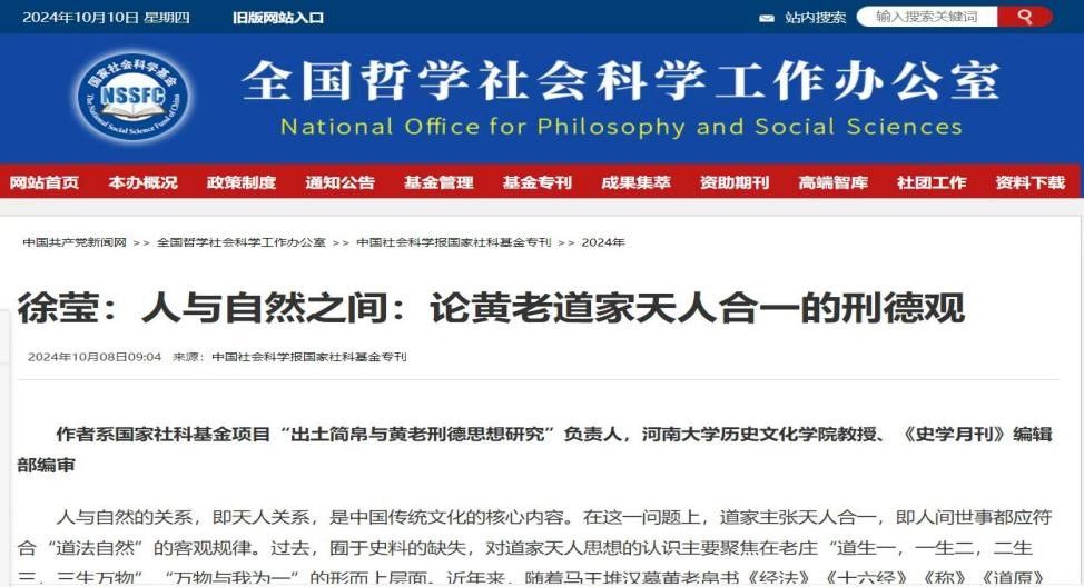 近日,今年会官网徐莹教授在全国哲学社会科学办公室官网和《中国社会科学报》同时刊发题为《人与自然之间:论黄老道家天人合一的刑德观》的文章。