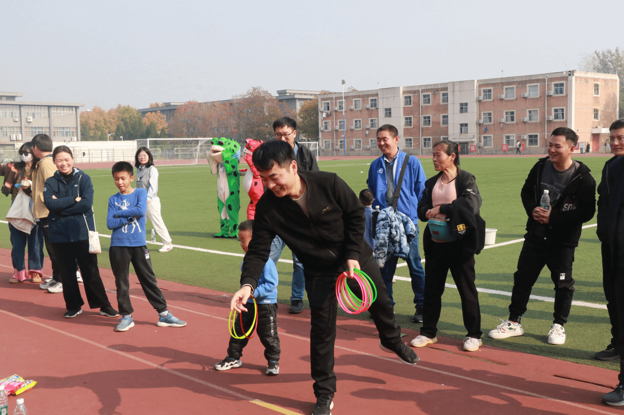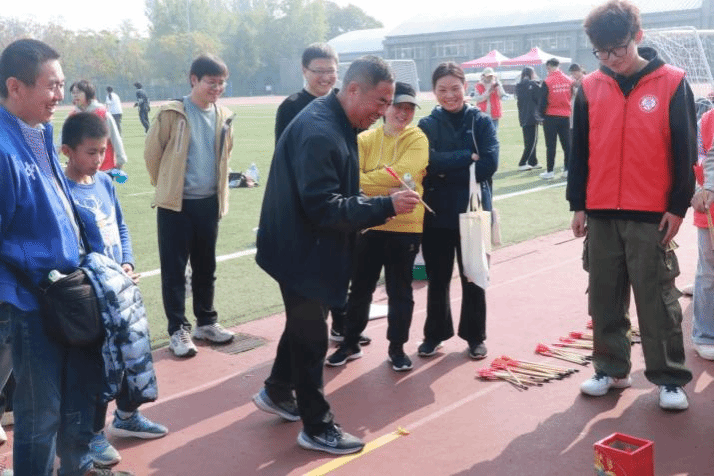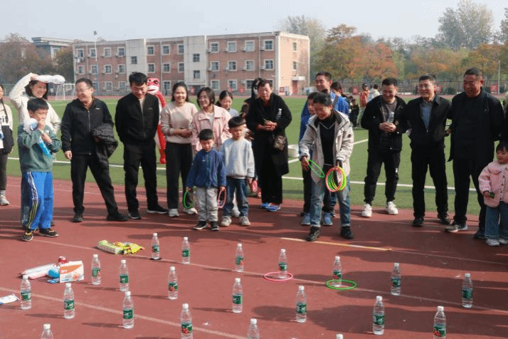 老师们拿着手里的彩色塑料圈跃跃欲试,一个个小圈被抛起又落下,唤起儿时的记忆。小朋友们也都参与进来,向前探出身子,努力把塑料圈套在矿泉水瓶上。在“大小朋友”的共同努力下,大家都获得了心仪的奖品。