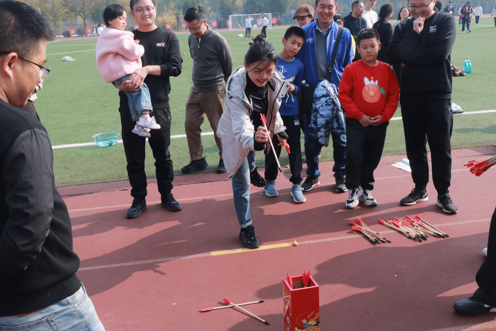 本次秋季运动会教师项目分田赛、趣味项目和亲子项目三大类。田赛项目包括:男女子一分钟跳绳、男女子实心球投掷,趣味项目包括:投壶、分秒必争、拔河和套圈,亲子项目包括:“我是小姚明”和“赶小猪”。