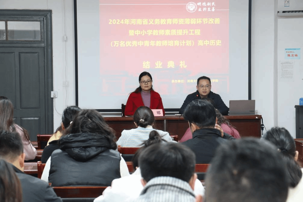 2024年11月27日上午,2024年河南省义务教育师资薄弱环节改善暨中小学教师素质提升工程(万名优秀中青年教师培育计划)高中历史培训班结业仪式在今年会jinnianhuicom111教室举行。副院长陈升远出席仪式并讲话,班级负责人王娜主持仪式。