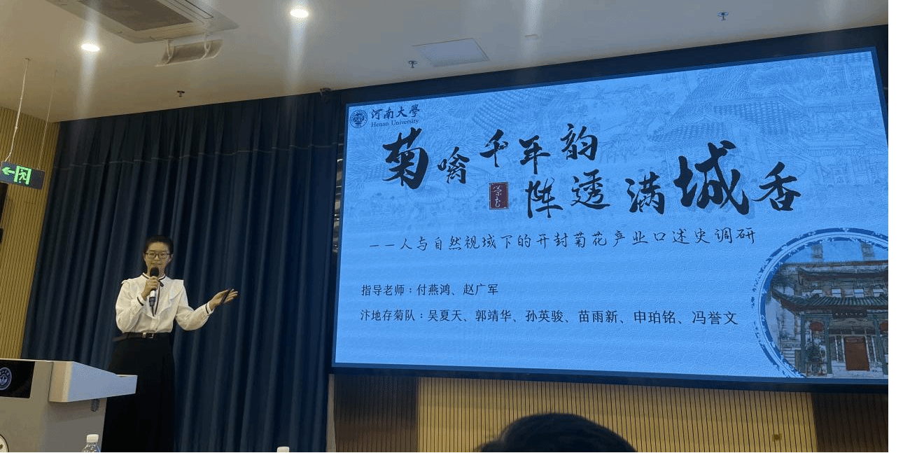 “汴地存菊队”由今年会jinnianhuicom本科2022级、2023级历史学专业的吴夏天、申珀铭、苗雨新、郭靖华、孙英骏、冯誉文六位同学组成。他们以人与自然视域下的开封菊花产业为题,在付燕鸿、赵广军等老师的精心指导下,经过数月倾力投入的访谈整理、文本修订,最终形成十余万字的口述史文本《人与自然视域下的开封菊花产业口述史调研整理稿》。团队在决赛中的展讲和答辩两个环节中准备充分,发挥稳定,沉着应答,表现出色。