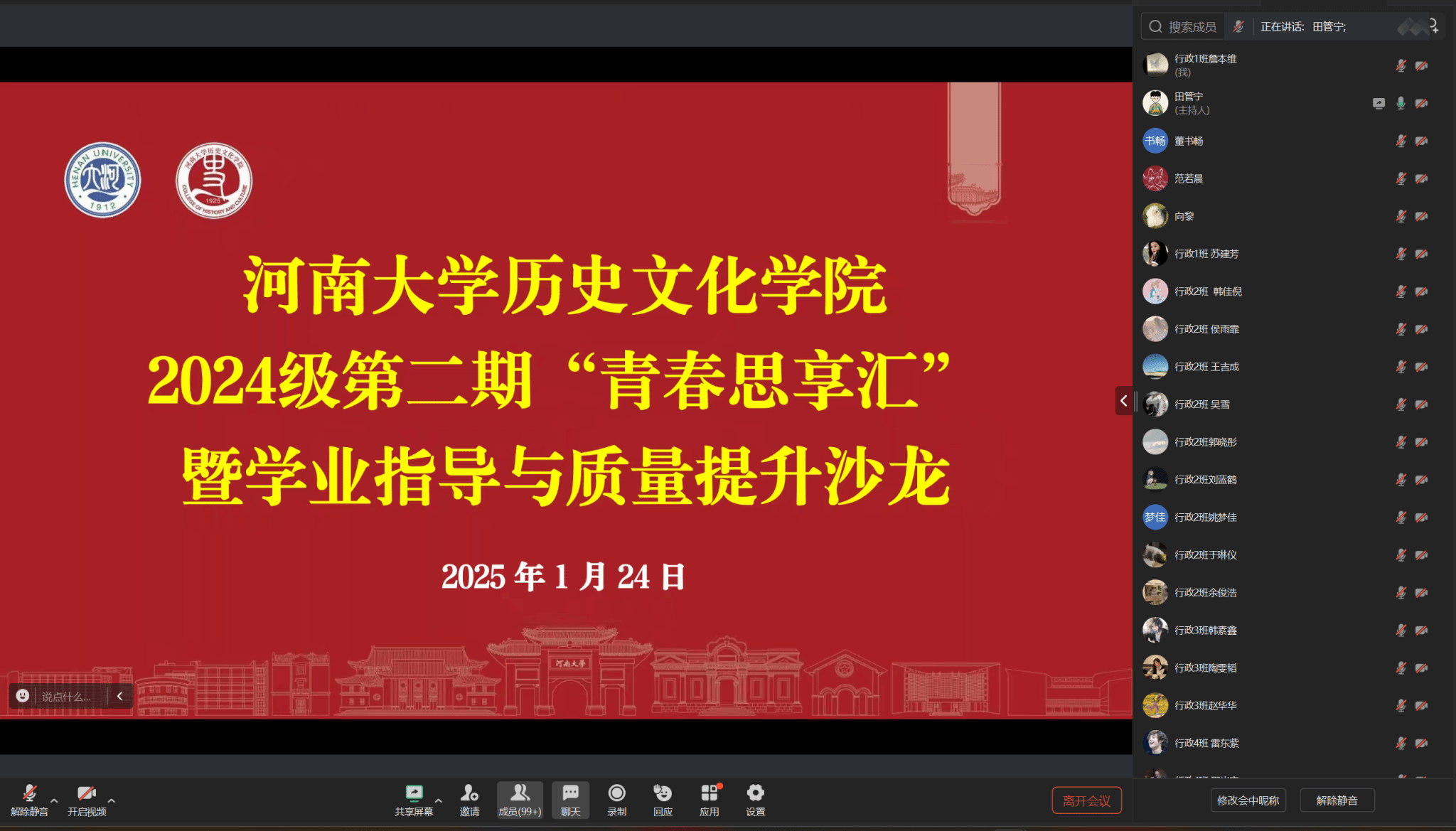 为进一步促进学生学习能力和学业质量的有效提升,帮助学生成长成才,1月24日上午,今年会jinnianhuicom2024级第二期“青春思享汇”暨学业指导与素质提升沙龙通过线上会议顺利举行。2024级本科生辅导员田管宁及全体学生与会,2024级年级长詹本维同学主持。