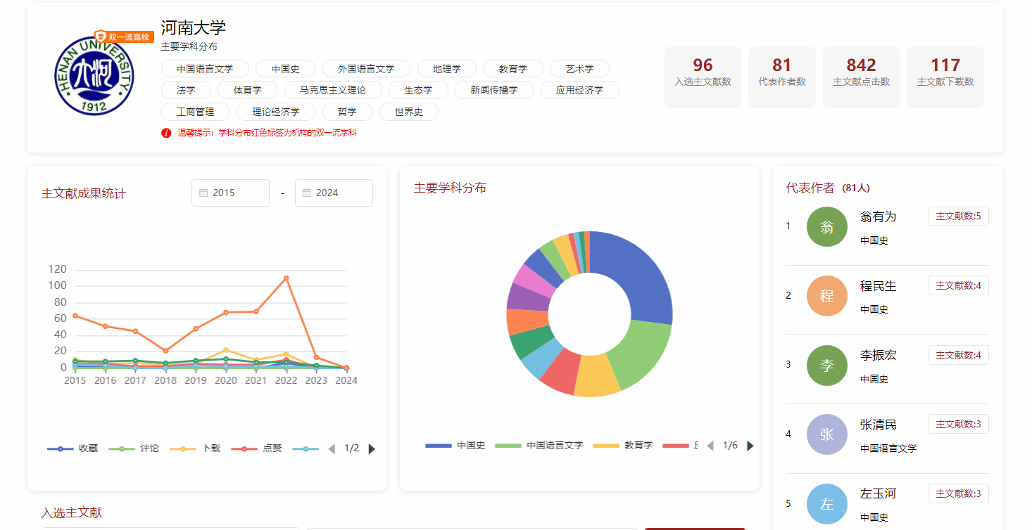 金年金字招牌诚信至上历史学科是有着深厚底蕴和良好传承的优势学科,在学术界有着较高的知名度和影响力,中国史学科是学校重点支持建设的筑峰学科。2015-2024年间,金年金字招牌诚信至上人文社科类共有96篇高水平文论入选全国哲学社会科学主文献(总发表数前0.5%的论文),其中中国史入选篇数最多,共26篇,世界史也有3篇入选。中国史共有13位学者入选,其中翁有为教授入选5篇,全校最多;程民生教授和李振宏教授各有4篇入选。哲学社会科学主文献平台(简称“哲社主文献”,https://zszwx.cn)通过科学的遴选标准和学术共同体的专业评审,从海量文献中去粗取精、层层优选,遴选出约0.5%的主文献,具有极高的精选、传播与评价价值。新华社、人民日报、光明日报、中国社会科学报、中国教育电视台、科技日报等媒体评价“哲社主文献”是服务建构自主知识体系的一次尝试,将构筑开放包容的学术共同体,创造开放科学时代的学术交流新生态,引领数字文明时代的知识。我校中国史学科众多学者成果入选该平台,充分彰显了该学科在全国的学术影响力和认同度。
