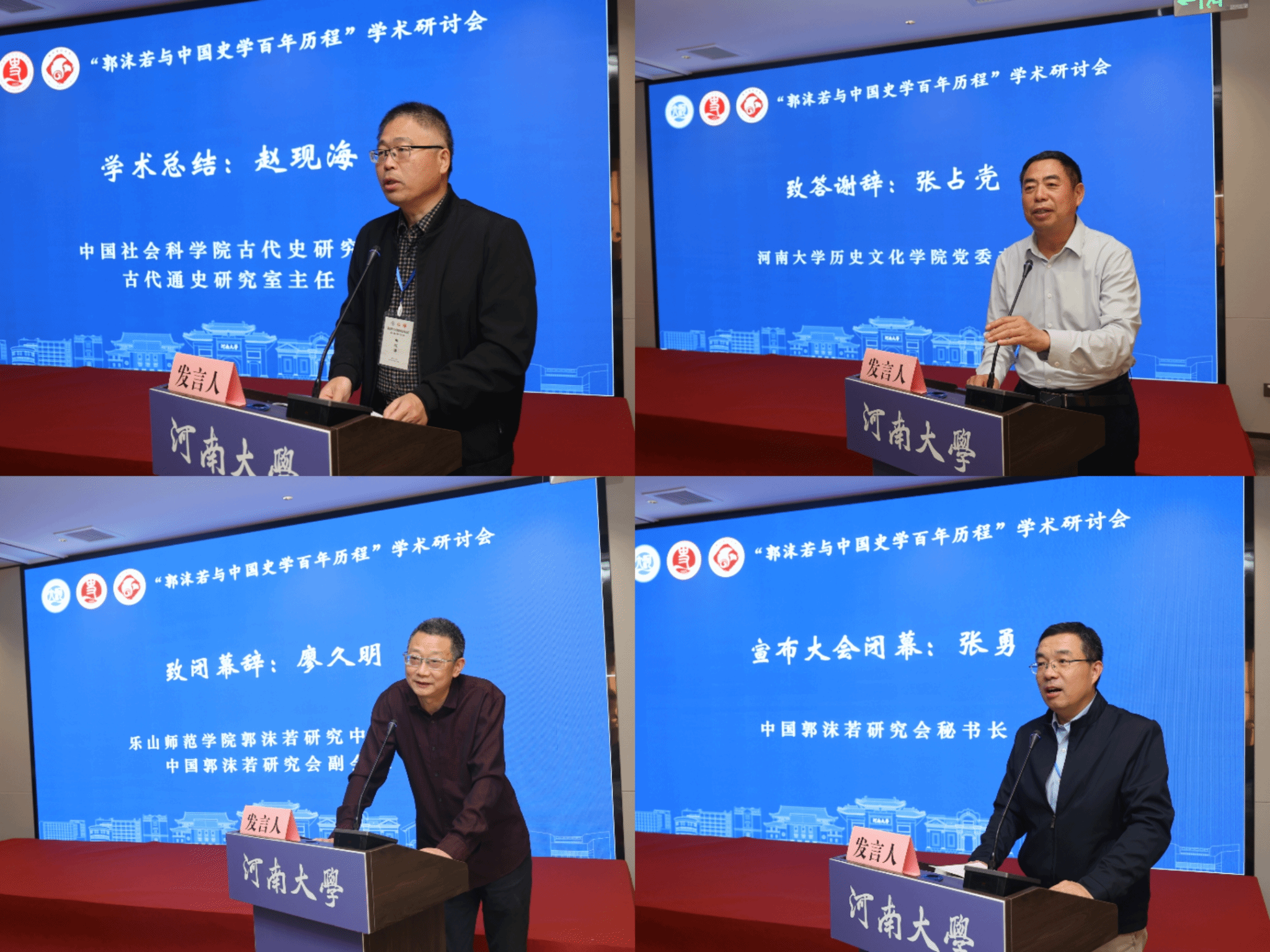 闭幕式由中国郭沫若研究会秘书长张勇主持。各分会场小组代表魏永康、董家宁、韩鼎分别汇报了小组研讨情况。中国社会科学院古代史研究所古代通史研究室主任赵现海作总结发言,全面总结了本次会议的学术内涵,他谈到此次会议是跨学科多角度交流的盛会,推动了学术发展朝着博大精深的方向发展。今年会jinnianhuicom党委书记张占党代表本届会议承办单位致答谢辞,对莅临本次会议的专家学者表示衷心感谢。乐山师范学院郭沫若研究中心主任、中国郭沫若研究会副会长廖久明致闭幕词,他谈到各位与会同仁围绕郭沫若与中国史学百年历程等诸多核心议题展开讨论,提升了本次盛会的思想高度。最后,张勇秘书长宣布会议圆满完成各项议程,本次会议在春意盎然的古都开封圆满落下帷幕。