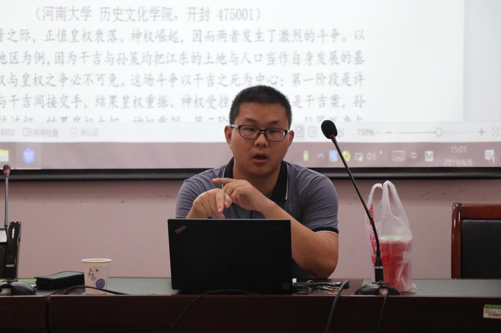 朱永清首先从神权与皇权之争问题的缘起谈起,他向在座同学们分别介绍了来自历史学界刘泽华先生和宗教学界葛兆光先生的两个观点,并提出他写这篇文章的理由。同时他强调了“新材料、新方法、新视角、新内容”是评价一篇好论文的四个要素,为同学们的写作提供了借鉴的经验。朱永清指出,汉晋之际正值皇权衰落、神权崛起,因而两者发生了激烈的斗争。他以汉末的江东地区为例,强调因为干吉与孙策均把江东的土地与人口当作自身发展的基础,所以神权与皇权之争必不可免。他描述这场斗争以干吉之死为中心:第一阶段是许贡案,孙策与干吉间接交手,结果皇权重振、神权受挫;第二阶段是干吉案,孙策与干吉直接过招,结果皇权大炽、神权重创;第三阶段是孙策案,孙策孤身与干吉余党对阵,结果神权反扑,皇权遭遏。总之,此次神权与皇权之争对孙吴的建国方略、道教的后世发展均产生了不可低估的影响。同时,他也给在座同学适当的扩展和延伸,在其中穿插了太平道的发展脉络,使同学们更加深刻地理解于吉孙策之争。