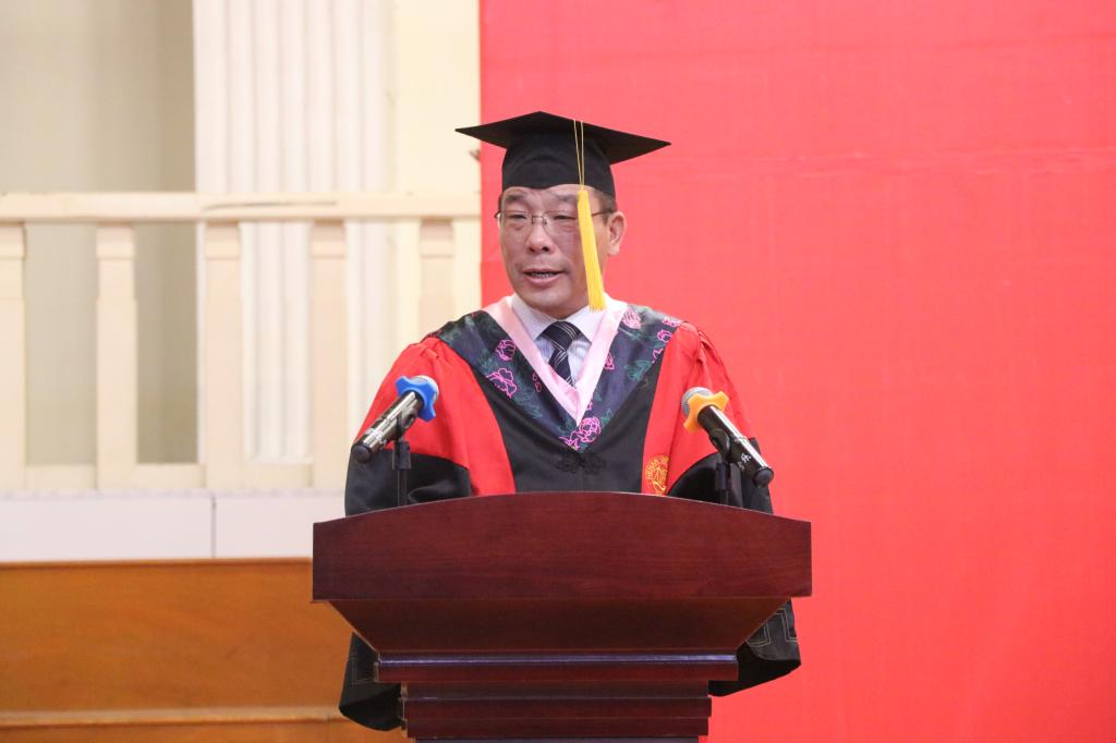 历史文化学院党委书记杨俊中讲话。他指出,四年前同学们带着梦想来到河大,在这一千四百多个日日夜夜里,校园的每一个角落里都留下了同学们奋斗拼搏的身影;如今毕业离校在即,希望同学们在今后的人生历程中坚定目标,不懈努力,对未来充满信心;在遇到难题时保持乐观的心态,积极向上;继续关注和支持母院的发展。最后,他饱含深情地说,母院永远是大家的精神家园,祝愿同学们在未来人生的道路上大放异彩。