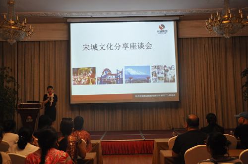 宋城,杭州第一个宋文化主题公园,亦是中国人气最旺的主题公园之一。同样是以宋文化为文化内涵,宋城和开封清明上和园在旅游文创产品、配套服务体系和旅游体验方面却有很多值得比较地方,因此,杭州宋城是培训班师生此次考察的必经之地。18日下午,培训班师生参加了宋城文化分享座谈会,由宋城景区负责人黄蕾向学员们介绍了宋城演艺公司架构和发展历程。