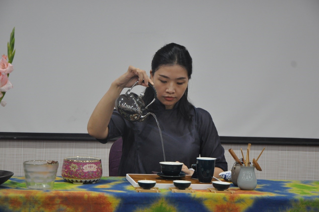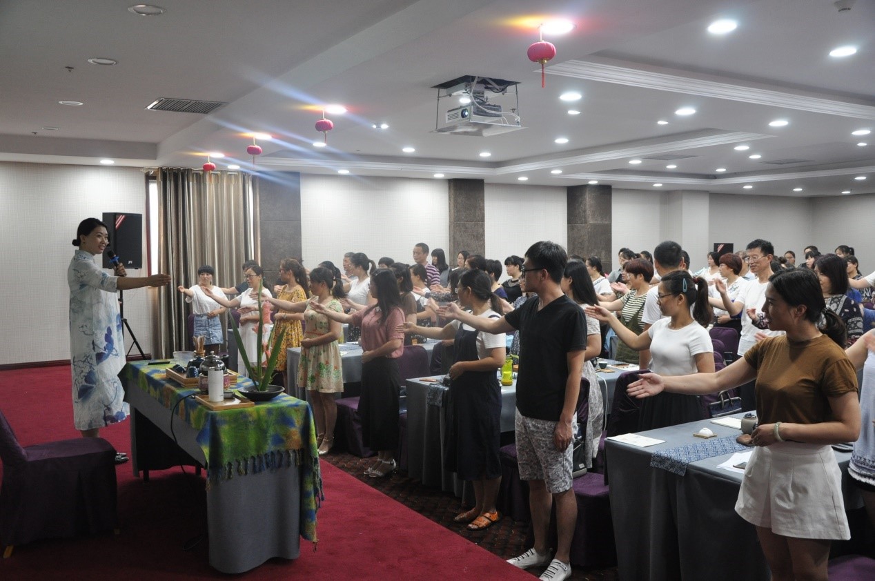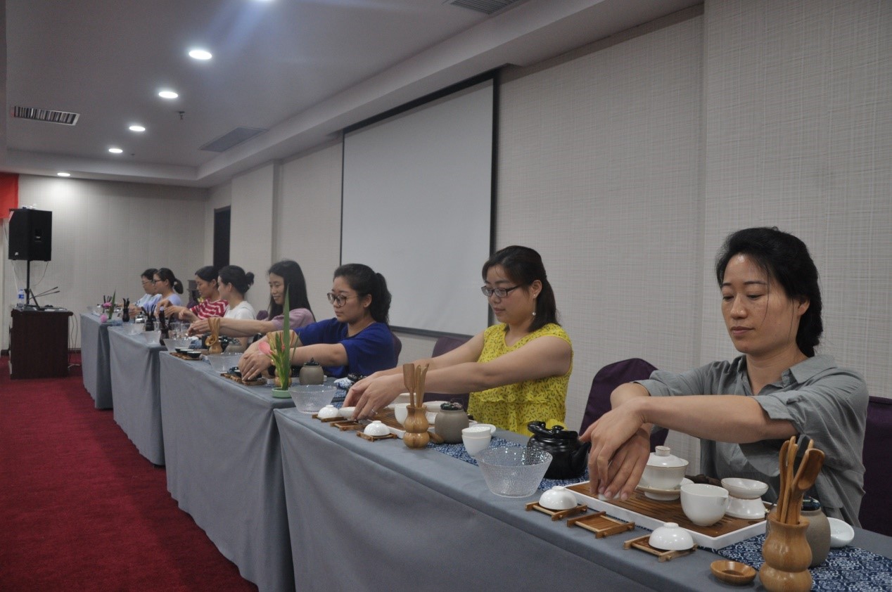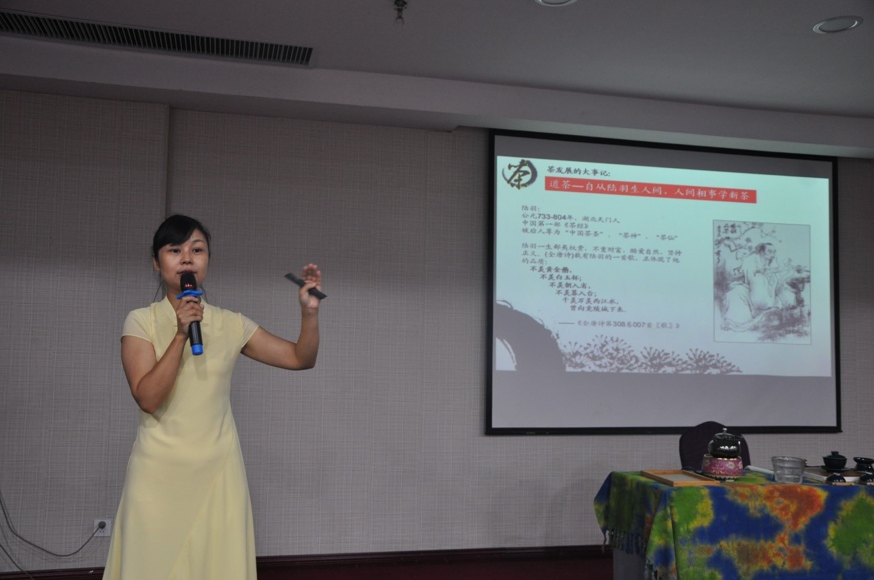 首先,由国家茶艺实训指导师贾泓俪带领学员们学习了中国茶的人文精神,贾泓俪老师以喝茶的益处为切入点,讲述了茶在中国的发展历史,并且教授了茶文化中的礼仪。