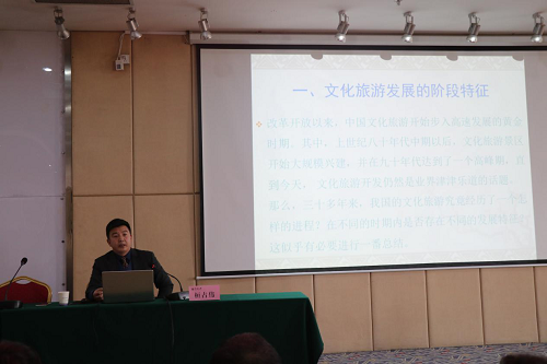 桓教授从文化旅游发展的阶段特征、开发认识误区、现实问题和发展展望四个方面展开讲座。桓教授首先回溯了改革开放四十年来文化旅游的发展进程。他用文物遗产时代、主题公园时代、旅游地产时代、创意旅游时代四个阶段总结了其发展历程。并由此延伸出四个阶段所带来的文化旅游开发的进展应该从原先的资源依赖到创意依赖;门票经济到体验经济;一枝独秀到产业融合;无序发展到模式发展。然而,在旅游发展的具体实践中,由于对文化的过度解读或理解偏差,文化旅游不可避免地走入一系列误区。桓教授以“诸葛亮南征北战”、“观世音东奔西跑”的形象比喻,以及景区中对历史、地理、佛教、诗词、考古、名人等文化的旅游化运用,总结出文化旅游发展进程中的表现出来的五大误区:缩小化误区;等同化误区;扩大化误区;概念偷换误区和概念化误区。而这些误区的背后,恰恰折射出当今文化旅游发展进程中的问题:开发过程中缺乏理论指导,盲目单一性强;封建迷信活动盛行;旅游文化内涵不够;过分追逐利益,忽视可持续发展;过分依赖模式导致羊群效应突出。最后,对于未来旅游发展如何应对这些问题,桓教授也从发展模式升级;发展空间升级;开发思维升级;盈利渠道升级;市场定位升级五个方面给出了自己的观点。