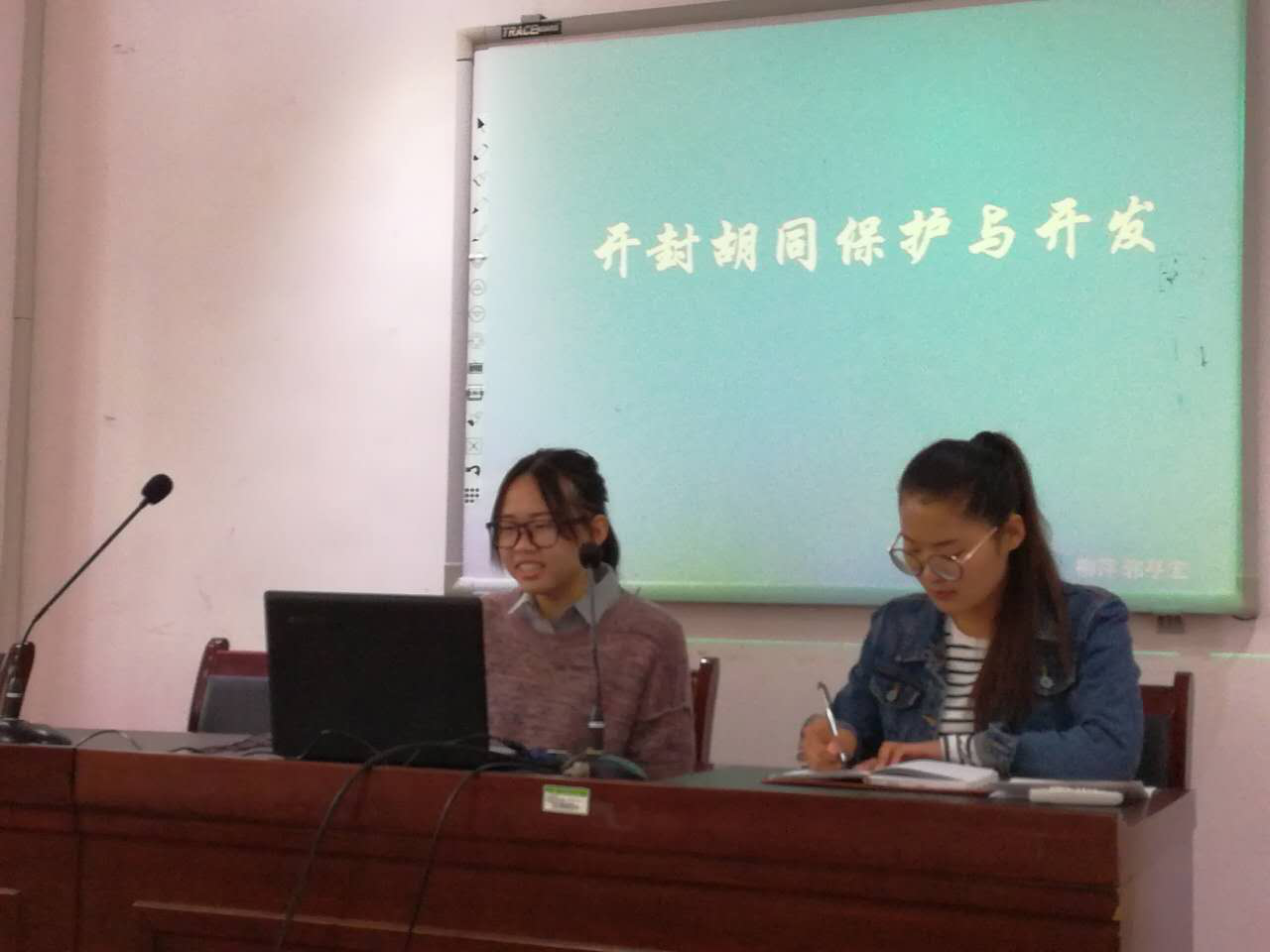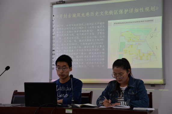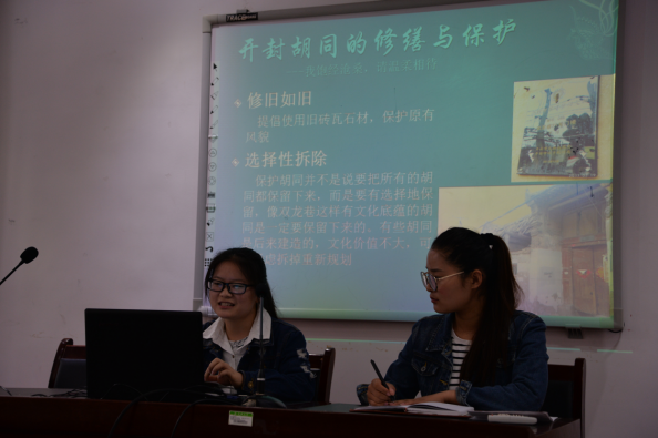 第二部分是主题汇报环节。15级旅游管理专业本科生易童就“开封双龙巷现状”进行了汇报,他首先对开封“七角八巷七十二胡同”作简要介绍,接着围绕《开封古城双龙巷历史文化街区保护详细性规划》展开,让我们看到了规划与现实的偏差,最后提出了关于双龙巷改造困局的一些思考。15级旅游管理专业本科生柳萍和郭亭宏以“开封胡同的保护与开发”为题作汇报,从开封胡同的历史文化内涵、胡同的修缮与保护、如何协调胡同开发与居民关系、胡同游开发方式探索四个方面进行了阐述。在前期实践调研的基础上,三位同学准备充分,逻辑清晰,为我们进行了较为深入的汇报。