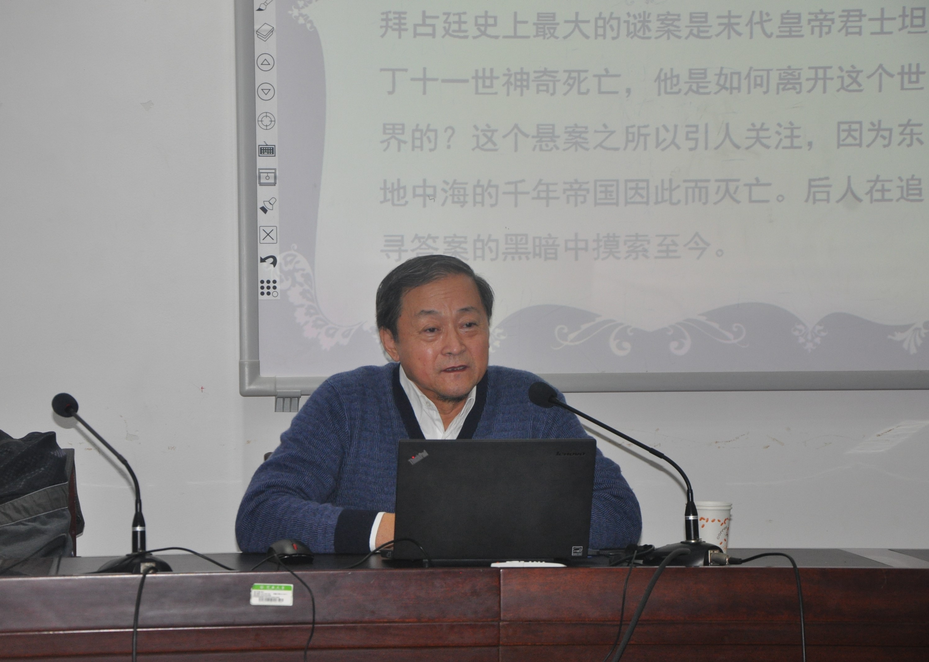 2016年12月15日晚,南开大学欧洲问题研究中心副主任、东欧拜占廷研究中心主任陈志强教授应邀在学院二楼会议室为广大师生带来题为“历史故事最难讲好——拜占庭末代皇帝之死”的专题讲座。讲座由院长苗书梅教授主持。现场座无虚席,气氛热烈。