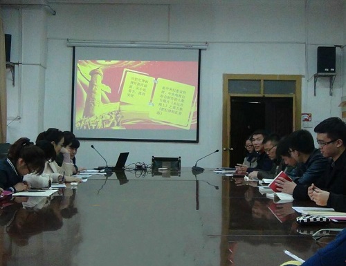 会议首先围绕习近平总书记治国理政新理念新思想新战略的重要意义展开,孙烨分主题、根基、保障、布局、发展等五大部分对“三新”内容进行介绍,并强调此次学习交流的目的是“贯彻落实习近平总书记治国理政重要精神、树立党员责任意识”。王文君老师接着传达了中国共产党第十八届六中全会精神,并就《关于新形势下党内政治生活的若干准则》、《中国共产党党内监督条例》的出台背景及新、旧《准则》及《条例》的内容进行对比,学习指出,党的十八届六中全会,是在我国进入全面建成小康社会决胜阶段召开的一次十分重要的会议,开启了全面从严治党向纵深推进的新征程,表明了党中央坚定不移推进全面从严治党的政治决心。