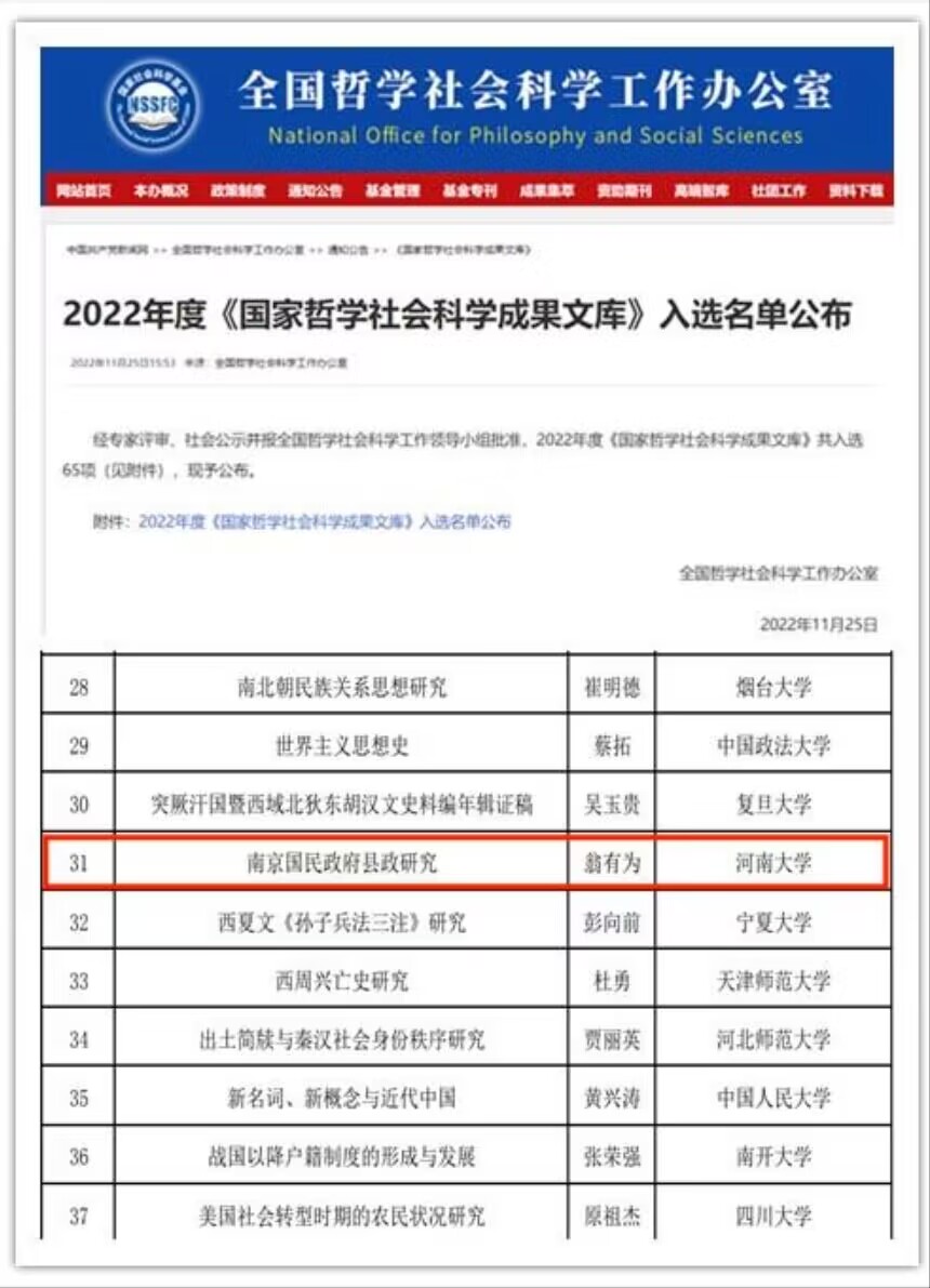 近五年来,中国史学科连续获批国家社科基金重大项目9项、重点项目4项(重大、重点项目量化得分居全国首位),一般及青年项目近20项;发表CSSCI论文200余篇,其中《中国社会科学》《历史研究》《中国史研究》《近代史研究》等顶尖期刊20余篇;在人民出版社、中华书局、三联出版社等出版学术著作68部,翁有为教授的著作《南京国民政府县政研究》入选国家哲学社会科学成果文库。