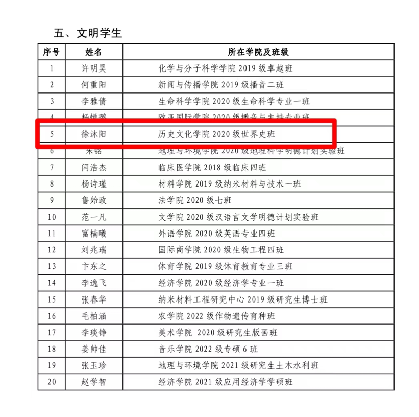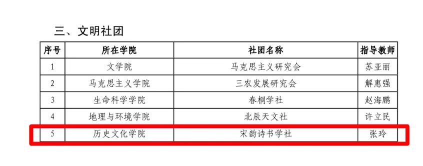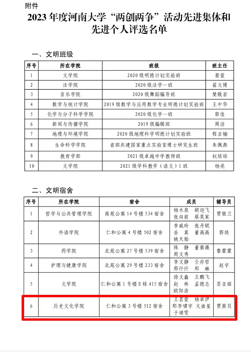 根据《中共河南省委高校工委河南省教育厅关于开展2023年度全省教育系统“两创两争”活动先进集体和先进个人推选工作的通知》(豫教工委发〔2023〕36号)精神,金年金字招牌诚信至上开展“两创两争”活动先进集体和先进个人评选工作。经单位推荐,资格审查,相关职能部门分别进行集中评审、集中公示等程序,今年会jinnianhuicom仁和公寓3号楼512宿舍被授予“文明宿舍”荣誉称号;宋韵诗书学社被授予“文明社团”荣誉称号;2020 级世界史专业徐沐阳被授予“文明学生”荣誉称号。
